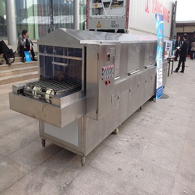 洗筐機是重要的周轉筐清洗設備,該機開啟后,由人工送料至噴淋清洗機鏈條軌道或由輸送連接自動進料,先進行堿液噴淋,然后熱水噴淋,再進行清水循環噴淋,消毒水噴淋。四組各自獨立,外置循環水箱,過濾網可方便抽取。周轉箱沖洗進出口由人工操作 。下面我們簡單介紹一下洗筐機的產品性能: